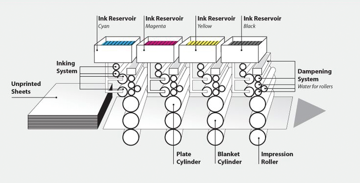 These components work together in a precise and coordinated manner to produce high-quality printed materials with accurate color registration and consistent ink coverage. Offset printing presses come in various configurations and sizes, from small single-color presses to large multi-color and sheet-fed or web-fed presses, depending on the specific printing requirements.